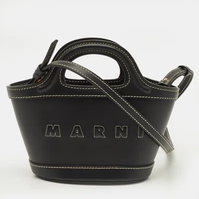 The Marni Tropicalia Micro tote is a compact masterpiece blending playful personality with Italian craftsmanship. The black leather structure is elevated by contrast stitching and subtle branding on the front creating a refined yet artsy silhouette. Perfect for days when you only need the essentials this micro tote brings a stylish dose of Marni's eclectic spirit to your collection.