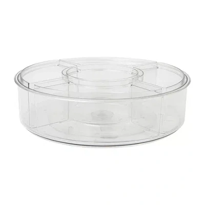 Whether it's paperclips and push pins or cotton balls and nail polish, the Martha Stewart 12-inch lazy Susan organizer will keep your desktop, countertop, and vanity surfaces neat and tidy. Comprised of transparent, crack-resistant, premium, bpa-free plastic, this compact organizer provides line of sight for each divided section so there is no guesswork in retrieving your items. Five removable compartments, four outer bins, and one center bin paired with 360 degrees swivel allows you to easily reach your supplies and accessories while the deep outer walls keep everything in place during rotation. Non-slip feet ensure the unit stays safely and securely where you place it, and a damp cloth makes cleanup a breeze. Add this compact storage center to any room in your home to help manage clutter and locate your items.Features: RotatingMeasurements: 11.75 Depth/Inches, 11.75 Width/Inches, 3.5 Height/InchesBase Material: 100% PlasticCountry of Origin: Imported