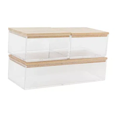 Maximize your space and optimize vertical real estate with this set of 3 Martha Stewart stackable plastic organizer bins with engineered wood lids. Home office and everyday organizational spaces will benefit greatly from the versatile design of these stacking storage bins. Made from premium bpa free, crack resistant plastic secured with durable and sturdy engineered wood lids, these storage boxes are ideal for desktops, counters, pantries, and bathroom vanities. The transparent body allows you to locate the contents of each container for quick and easy access while the stackable design makes the most of unused space. Wipe clean with a dry cloth to maintain the like-new condition of your storage solution.# Pieces In Set: 3Features: Multi-Pack, StackableMeasurements: 7.5 Width/Inches, 3 Depth/Inches, 2 Height/InchesBase Material: 100% PlasticCountry of Origin: Imported