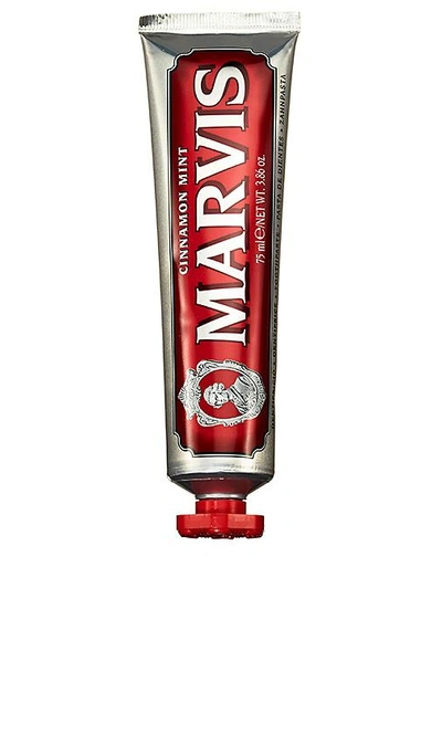 Marvis Cinnamon Mint in Beauty: NA. Marvis Cinnamon Mint in Beauty: NA. Modernizing the way we think about toothpaste, Marvis combines an extraordinary formula with decadent flavors created by offsetting the unmistakable aroma of mint with innovative notes for a long-lasting, pleasurable taste sensation. The Marvis Formula is based on a traditional processing method that guarantees a dense, compact, luxurious texture while offering maximum protection against tooth decay, tartar, plaque, and bad breath.. Cinnamon Mint - exotic, spicy cinnamon enhanced by refreshing mint. Freshens breath while providing a whitening effect. Vegan, paraben-free, phthalate-free, gluten-free, fluoride-free, and cruelty-free. 3.8 fl oz. Brush thoroughly at least twice per day and after meals, or as directed by a dentist. MVIS-WU9. 411086. Marvis revolutionized the concept of toothpaste. Straight from Florence, Marvis is a superior dental brand beloved in Italy for generations. Marvis changed the story, transforming an everyday ritual into something remarkable, unexpected, and blissful. Marvis flavors are created by offsetting the aroma of mint, to provide the freshness you need with innovative notes to offer you a long-lasting, pleasurable taste sensation that can be different every day. The Marvis formula: white, protected teeth, long-lasting fresh breath and aid in preventing tooth decay, tartar and plaque. Paraben-free. Phthalate-free. Gluten-free. Cruelty-free. Vegan.