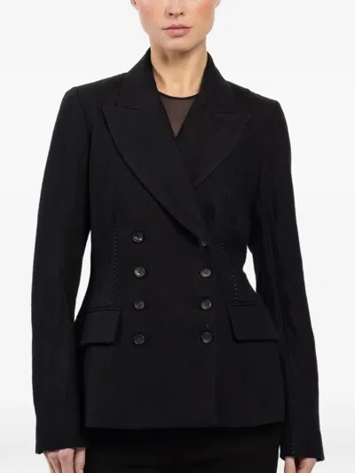 black topstitching double-breasted button fastening peak lapel front flap pockets