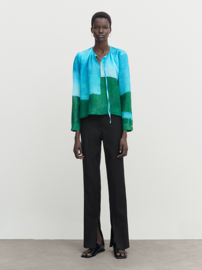 MASSIMO DUTTI Cropped Ramie Printed Blouse With Drawstrings In Türkis