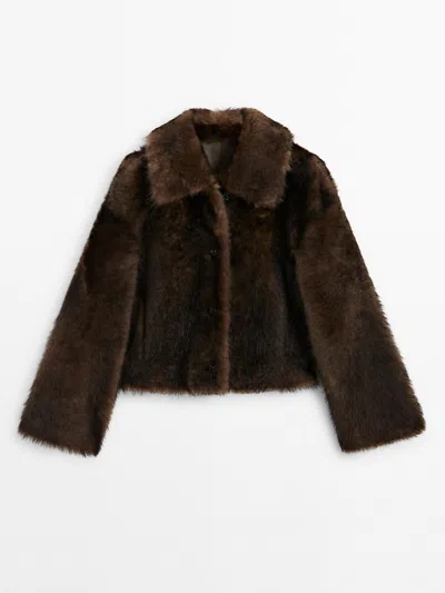 Shirt collar. Long sleeves. Two side pockets. Button-up front. Short coat made of 100% leather with fur