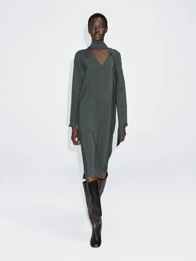 Batwing sleeves. Tie-neck. V-neck . Midi-cut dress. Central back opening