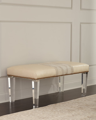 Handcrafted leather bench with croc-embossed insert. Furniture grade hardwood frame on seat. Acrylic legs. Brass nail head trim. Stapled and glued. Suspended coil spring system. Mortise and tenon construction. 47"W x 22"D x 20"T. Dry clean. Made in the USA of imported materials. Boxed weight, approximately 48 lbs.
