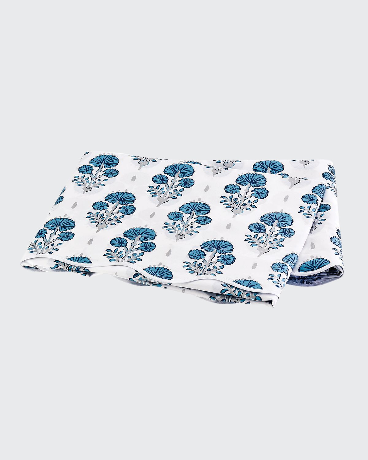 Floral flat sheet with scalloped edge. 500-699 thread-count Egyptian cotton. Machine wash. 112" square. Made in the USA of Italian materials.