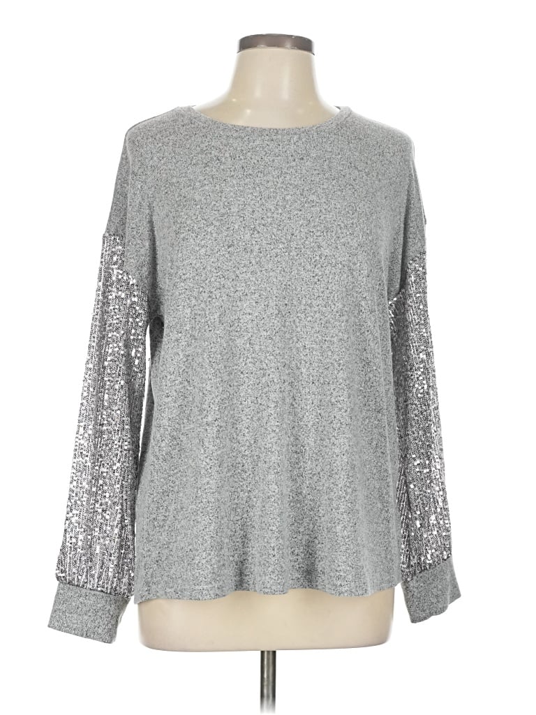Maurices Pullover Sweater, Size: Large. Item Details: Silver, Metallic Pattern, Crew Neck, Long Sleeve, Glitter, Women's Tops, Rayon/Polyester/Spandex