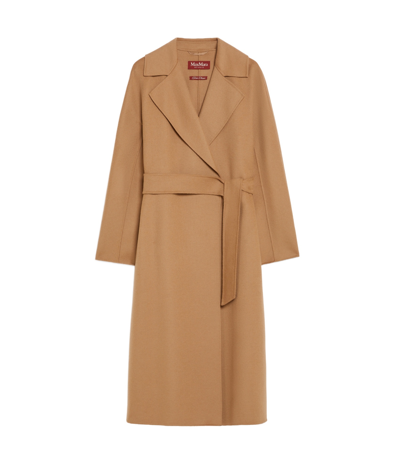 Long wrap coat with an oversized volume, made of luxurious pure camel hair beaver cloth. The straight style is lined and features a lapel collar, long kimono sleeves and patch pockets on the front. Finished with a central slit at the back. It fastens with a matching belt that accentuates the silhouette.
