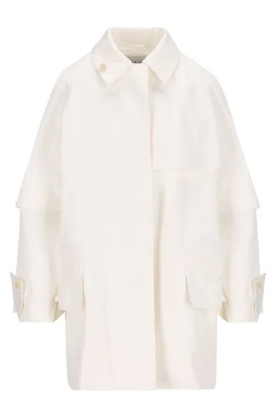 - Material: 100 percent cotton - Color: white - Lining: 100 percent cotton - Other details: asymmetrical bib at front, raglan long sleeves with toggles at cuffs and cut-out pattern at elbow height - Matching belt allows waistline to be highlighted - Button closure - Made in Italy - Item code: 2511021053600001