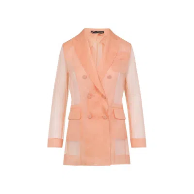 Max Mara Pianoforte introduces the Esopo Organza Jacket, crafted from luxurious pure pink silk. This elegant piece features a notched collar and a double-breasted front, showcasing a transparent organza design. Practicality is highlighted with chest patch and side flap pockets, while long sleeves with buttoned cuffs add a refined touch. The straight hem completes the sophisticated look, perfect for both formal and casual outfits. Material - Pure pink silk Design - Notched collar, double-breasted front Structure - Transparent organza Pockets - Chest patch and side flap pockets Sleeves - Long with buttoned cuffs Hem - Straight