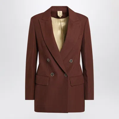 Double-breasted jacket by Max Mara in earth-coloured grain de poudre wool, characterized by pointed lapels, long sleeves with buttoned cuffs, front closure, contrasting lining, a welt pocket on the chest, two flap pockets on the front, and a back vent. Model wears size 38 IT Model measurements: Height: 178 cm Chest: 83 cm Waist: 63 cm Hips: 91 cm Fabric I: 100% Virgin wool / Lining: 69% Acetate - 31% Cupro / Sleeve lining: 65% Viscose - 34% Polyester - 1% Cupro