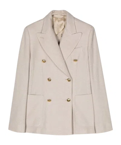 Vanadio straight-line double-breasted blazer by Max Mara made of soft beige cotton jersey. Semi-lined model, featuring a peaked lapel collar, breast pocket and patch pockets on the front. Finished with a central back vent and inside breast pocket. Gold button fastening. Composition: Knitted Fabric: 100% Cotton. Lining: 68% Acetate, 32% Polyester.