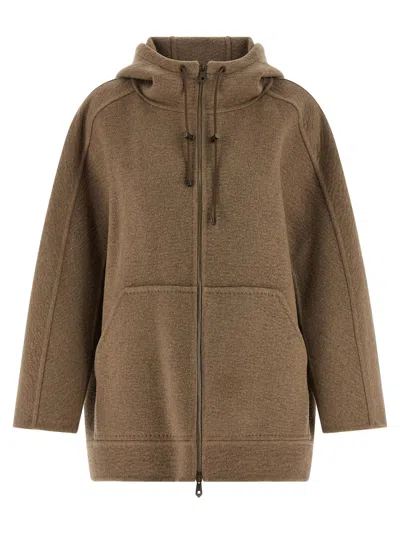 'Gradi' double hand-stitched coat of pure washed cashmere, fleece style, adjustable hood with leather drawstring, front zip closure, pockets, long wide sleeves with dropped shoulder, unlined. MAX MARA 'Gradi' coat Cocoon fit
