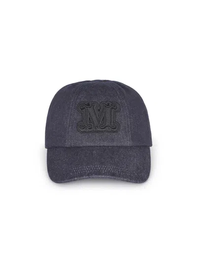 Max Mara "Lella" hat made of dark blue denim. Baseball cap with a semi-rigid visor. Contrasting M Monogram patch applied on the front. Cotton lining. Adjustable strap with metal buckle at the back. 100% cotton Made in Italy