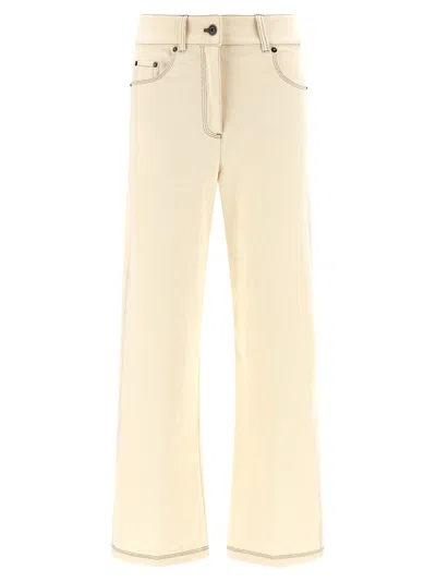 Mxpribes' denim-effect jersey pants, 5-pocket style with denim-style details, contrast stitching and metal rivets, medium waist with straight leg and slightly cropped length, front button and zip closure, belt loops at the waist, leather back logo tag.SpecificationValueBrandMAX MARAComposition57% cotton 36% polyester 7% elastaneMade InChinaSize & FitTrue to size fit ColorWhiteGenderWomenSeasonSpring Summer 2026
