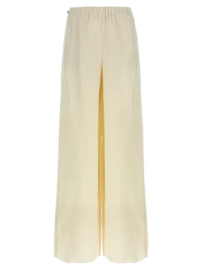 'Onore' pants in washed linen and silk twill, high waist model with wide leg, elastic waistband with metal eyelets and drawstring on the sides, pockets.SpecificationValueBrandMAX MARAComposition60% flaxlinen 40% silkMade InItalySize & Fittrue to size fitColorWhiteGenderWomenSeasonSpring Summer 2025