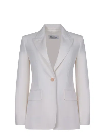 White wool single-breasted jacket. It features pointed lapels, a classic one-button closure, two front pockets with flaps, buttoned cuffs, and two rear vents. The model is 179cm tall and wears a size IT 40. Size nationality: IT Composition: Ext: 100% Wool; Int: 65% Acetate, 35% Polyester