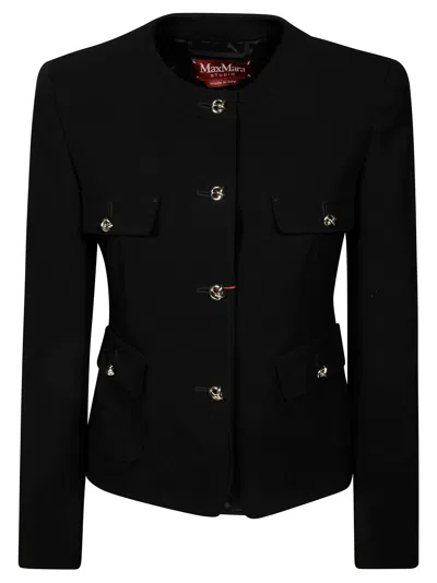 Max Mara Studio presents a meticulously tailored jacket that embodies sophistication and refinement. The structured silhouette and round neckline create an elegant profile, while long sleeves enhance its classic appeal. Decorative flap pockets add functional charm, and the smooth fabric finish elevates this piece as a staple for both casual and formal occasions.- 100% polyester - Tailored style - Designed for women - Made in Italy
