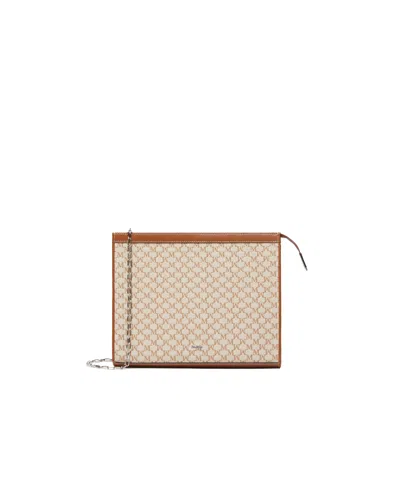 This Max Mara clutch grande embodies sophistication with its structured rectangular shape and subtle logo pattern on a light backdrop. Rich brown trim adds to its allure, while the detachable chain strap provides versatility for various occasions. A sleek zipper closure ensures secure storage, making it an ideal accessory for discerning individuals.- Structured rectangular silhouette- Subtle logo pattern- Rich brown trim- Detachable chain strap- Sleek zipper closure