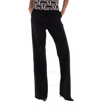 Elevate your everyday wardrobe with the Max Mara Lari Trouser. This classic trouser in black features dual front angled pockets, a zip fly with button and slide tab closure, and a flattering 12.25 inch rise. The trouser is made from a luxurious blend of 78% viscose, 16% polyamide, and 6% elastane for a comfortable and stylish fit. Designed with the modern woman in mind, these pants are perfect for any occasion. Pair them with a blouse and heels for a polished look, or a casual tee and sneakers for a more relaxed vibe. Embrace the feminine and sophisticated style of Max Mara with the Lari Trouser. Available in multiple sizes, the inseam approximately measures 35 inches. Dry clean only. Imported. Model is 5'10 and is wearing a size 10. Measurements may vary slightly by size.