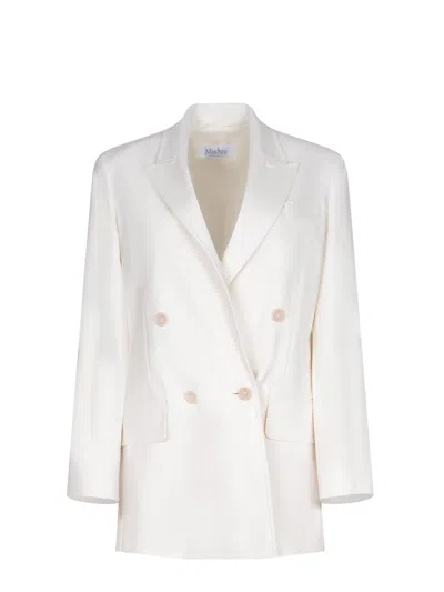 Max Mara "Suez" blazer made of white wool. Double-breasted. Blazer in stretch cotton twill. Notched lapel collar. Long sleeves. Buttons on the cuffs. Front button closure. Chest pocket and flap pockets on the front. Double vent at the back. Lined with Monogram jacquard fabric. 95% cotton, 5% elastane. Made in Italy.