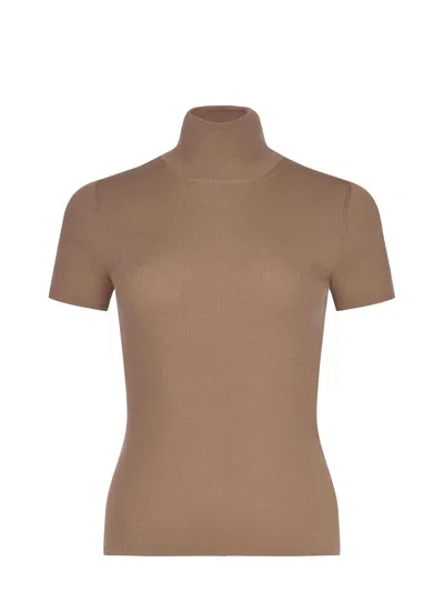 Max Mara sweater "Afa1234" made of camel-colored wool. Ribbed. High neck. Short raglan sleeves. Half zip at the back of the neck with a custom enamelled pull. 100% virgin wool Made in Italy