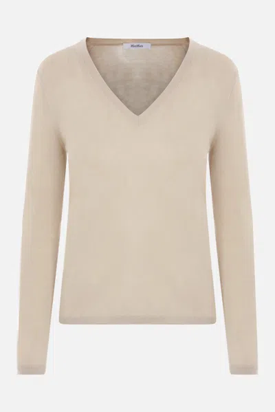 Max Mara sweater made of beige cashmere knit. It features a V-neck, long sleeves, ribbed edges and a straight hem.