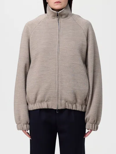 Max Mara sweatshirt crafted from taupe wool and cotton blend double jersey, featuring embossed logo lettering on the back. Designed with a high collar, two-way front zip closure, concealed side pockets, long raglan sleeves, and elasticated trims.