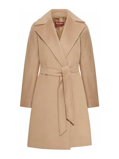 Wool robe coat, pure wool drap coat, flared fit, distinctive lapel collar, long kimono sleeves, robe closure with matching belt, welt pockets at the sides, lined, the model is wearing a size 40 (it) and is 177 cm tall. her measurements are: waist 60 cm and hips 90 cm, color: camel
