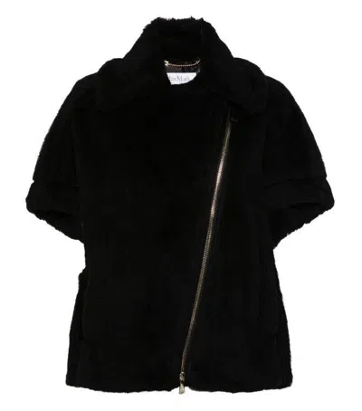 black alpaca wool-blend shearling off-centre front zip fastening side button fastening wide notch lapels half-length sleeves two side welt pockets logo-jacquard lining straight hem. Composition. : 62% wp 26% wo 12%se. Country Of Manufacture. : Italy. MPN. : 2424736272600NEWMANTO1008. .