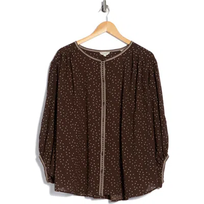 Cut from lightweight fabric, this front-button top showcases an eye-catching print, contrasting trim and three-quarter sleeves. 25 5/8" length (size 1X) Front button closure Jewel neck Three-quarter sleeves 97% polyester, 3% spandex Machine wash, line dry Imported