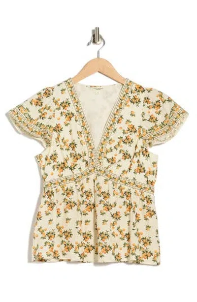 A fruity print brings sunny-day charm to this lightweight cotton-blend top framed by fluttery cap sleeves and a flowy peplum. 24 1/2" length Deep V-neck Cap sleeves 60% cotton, 40% rayon Machine wash, line dry Imported