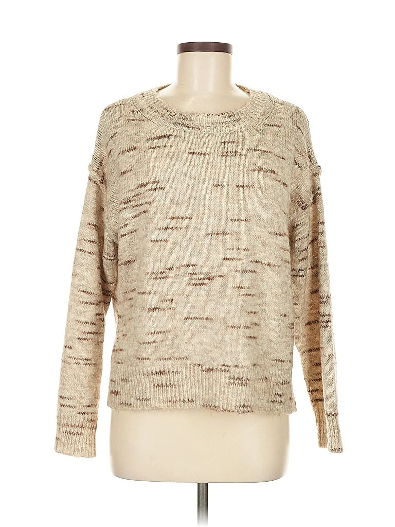 Max Studio Pullover Sweater, Size: Medium. Item Details: Tan, Metallic Pattern, Keyhole Neckline, Long Sleeve, Ripped, Women's Tops, Polyester/Acrylic