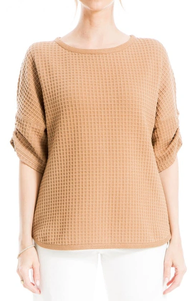 MAX STUDIO Ruched Elbow Sleeve Waffle Knit Top In Camel