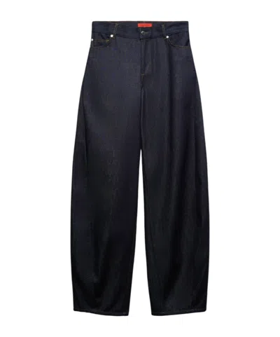 Mid-waist design with belt loop, five pockets, contrasting topstitching, and a placket with a concealed zipper and buttons.