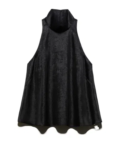 High-neck, open-back design with a flared cut, reverse pleats and an invisible zipper at the back, unlined, standard fit.