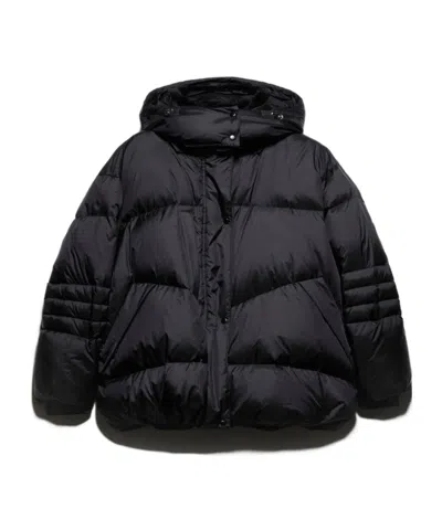 Made with recycled down filling, features a high collar and detachable hood, front welt pockets, and a zip and snap button closure.