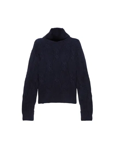 Cable knit pattern and ribbed knit trim, high neck and long sleeves.