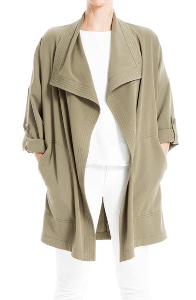 An open front with a flowy draped collar adds movement to this classic woven jacket, an ideal garment for layering. - Drape collar- Long sleeves with roll tabs- Open front- Solid- Woven construction- Approx. 34" length- Imported Machine wash 95% polyester, 5% spandex