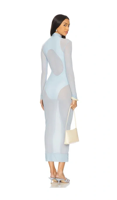 Maygel Coronel Jacaranda in Baby Blue. Maygel Coronel Jacaranda in Baby Blue. Self: 77% polyamide 23% elastane Lining: 78% polyamide 22% elastane. Made in Colombia. Hand wash cold. Step-in bodysuit lining. Lightweight sheer jersey fabric dress with mockneck styling. Detached opaque midweight jersey bodysuit with cut-out back design. Garment is intentionally sheer, undergarments will show through Please note undergarment is included. MAYR-WD31. VT-110-SK.
