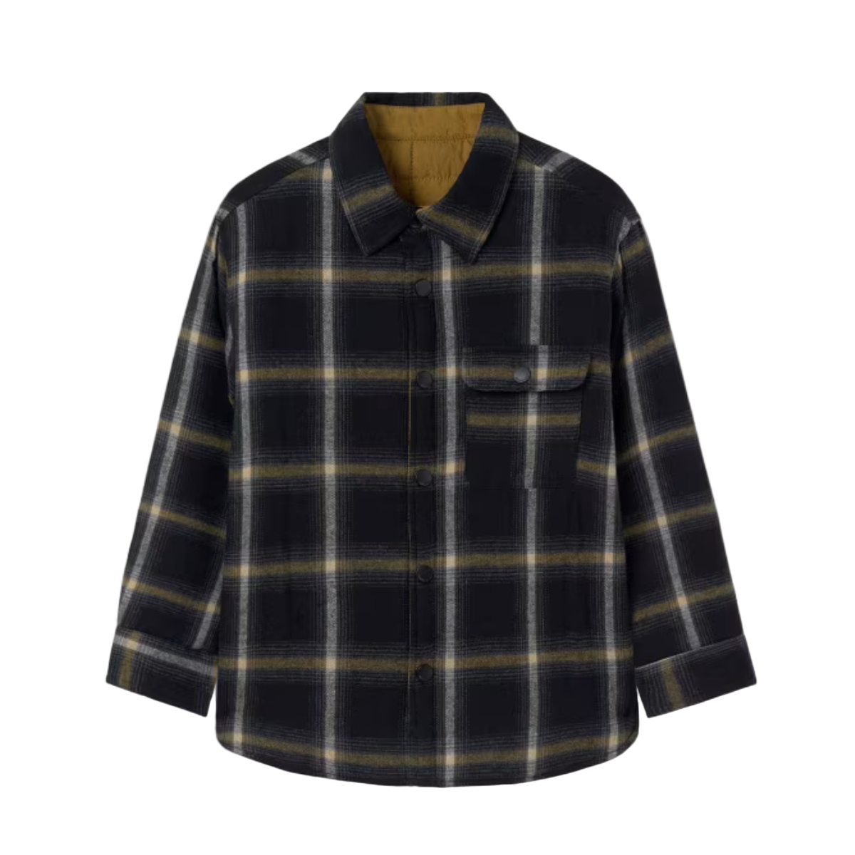 This reversible Quilted Overshirt is a practical and stylish choice for cooler days. Designed with comfort and versatility in mind, this overshirt features a lightweight quilted finish on one side and a smooth fabric on the other, offering two looks in one. Perfect for layering, it provides just the right amount of warmth without feeling bulky. The snap-button front makes dressing easy, while front pockets add a functional touch. 100% Cotton Long sleeve Classic collar Front button closure Chest flap pocket Plaid pattern Black-white-yellow colorway Mustard yellow lining Midweight fabric Imported