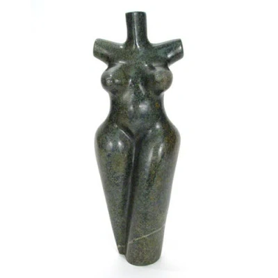 This stunning Shona sculpture of a female torso is hand carved in serpentine stone. The Shona of Zimbabwe, literally translated as "the house of stone," are considered by many to be among the world's finest sculptors. Modern Shona artisans select and quarry their own stones, just as they did thousands of years ago. Statues are hand-carved using simple chisels, polished with sand and beeswax, and heated on a fire to bring out their brilliant colors. Artist: James Chidzenga Made In: Zimbabwe