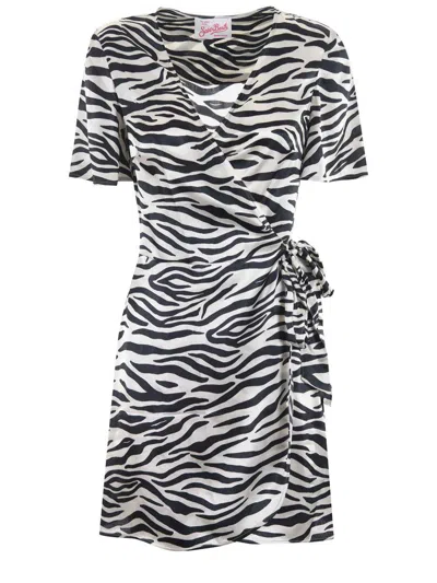 Abitino MC2 Saint Barth in viscosa satin Avorio/Nero fantasia zebra. Scollo a punta. Chiusura a portafoglio con fiocco da annodare. Manica corta.Misura in foto S64% viscosa, 36% rayon