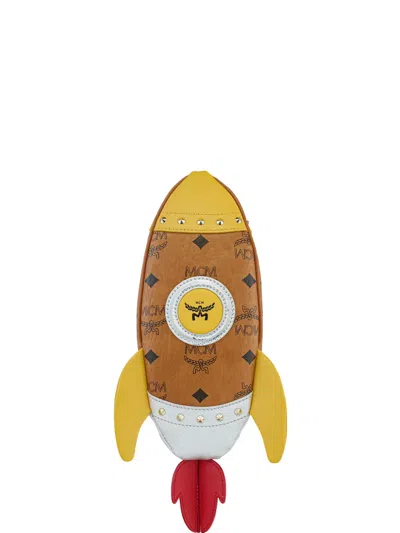 Visetos monogram canvas rocket crossbody bag with metal stud hardware and natural leather trim Approximately 3.9 x 9.4 x 3.7 inches 46" to 52.4" cm strap length Detachable, adjustable leather crossbody strap MCM logo motif Metal stud details Zip compartment 24k gold-plated metal hardware