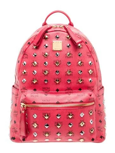 MCM Backpack Pink Printed Multitonal Hardware Flat Handle & Dual Shoulder Straps Studded Accents & Single Exterior Pocket Logo Jacquard Lining & Three Interior Pockets Zip Closure at Side | MCM Backpack in Pink
