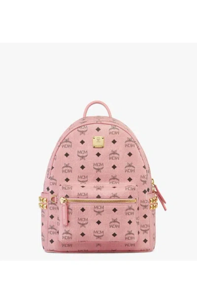 Visetos monogram canvas backpack with pyramid stud embellishments and natural nappa leather trim Adjustable shoulder straps Leather top handle MCM logo plate Front zip compartment Outer side pockets with studded embellishments Two-way zip closure Interior pocket and sleeve