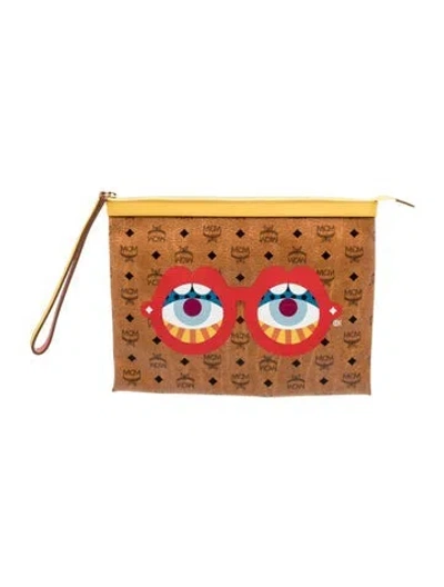 MCM Clutch Black & Brown Monogram Pattern Gold-Tone Hardware Leather Trim Wrist Strap Leather Trim Embellishment Canvas Lining & Single Interior Pocket Zip Closure at Top Includes Dust Bag | MCM Monogram Clutch in Black/Brown