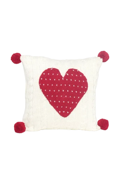 Handmade Valentine pillow featuring a vibrant red heart with delicate white accents against a creamy, cable-knit background, this pillow is a perfect blend of elegance and charm. The playful pom-poms on each corner add a whimsical touch, making it an ideal accent for your Valentine’s Day décor or any space needing a little extra love.Crafted with care, this pillow is soft, stylish, and versatile — perfect for your sofa, chair, or bed. It’s also a thoughtful gift for loved ones to cherish year-round.10" x 10" Includes a cotton/polyester insert that is made in the USA Hand wash with mild soap and flat to dry Hand-crocheted button closure on back Handmade and fairly traded