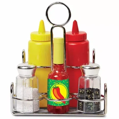 A must-have for the well-appointed play kitchen, these condiments sound and look like the real thing! Packaged in a handy metal caddy to keep everything organized, the six-piece set includes ketchup, mustard, salt, pepper, and hot sauce. Best of all: The salt and pepper really "shake," the hot sauce really "pours," and the ketchup and mustard "squirt" string! These wonderfully durable play pieces are built to last through countless culinary adventures.# Pieces In Set: 20Features: Non-ToxicRecommended Ages: 3 Years And UpBase Material: 100% PlasticCare: Wipe CleanCountry of Origin: Imported