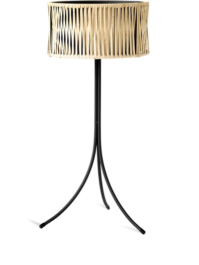 Black/beige rattan fibres Umanoff handwoven planter from Menu featuring woven wicker design, cylindrical design, open top and curved leg.